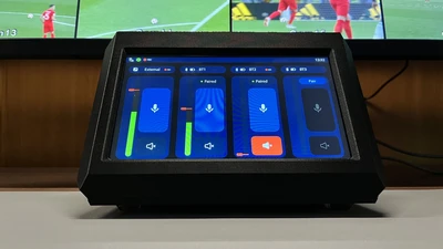 A 7-inch high-resolution touch screen serves as the main control panel. The display presents all system communication settings and allows for real-time adjustments. Users can configure the system and connected headsets to meet the requirements of the specific task. For example, the audio from on-field communication can be set at 30–40% volume for all referees' headsets as a background, while a specific staff member can monitor the same audio feed at 100% volume.