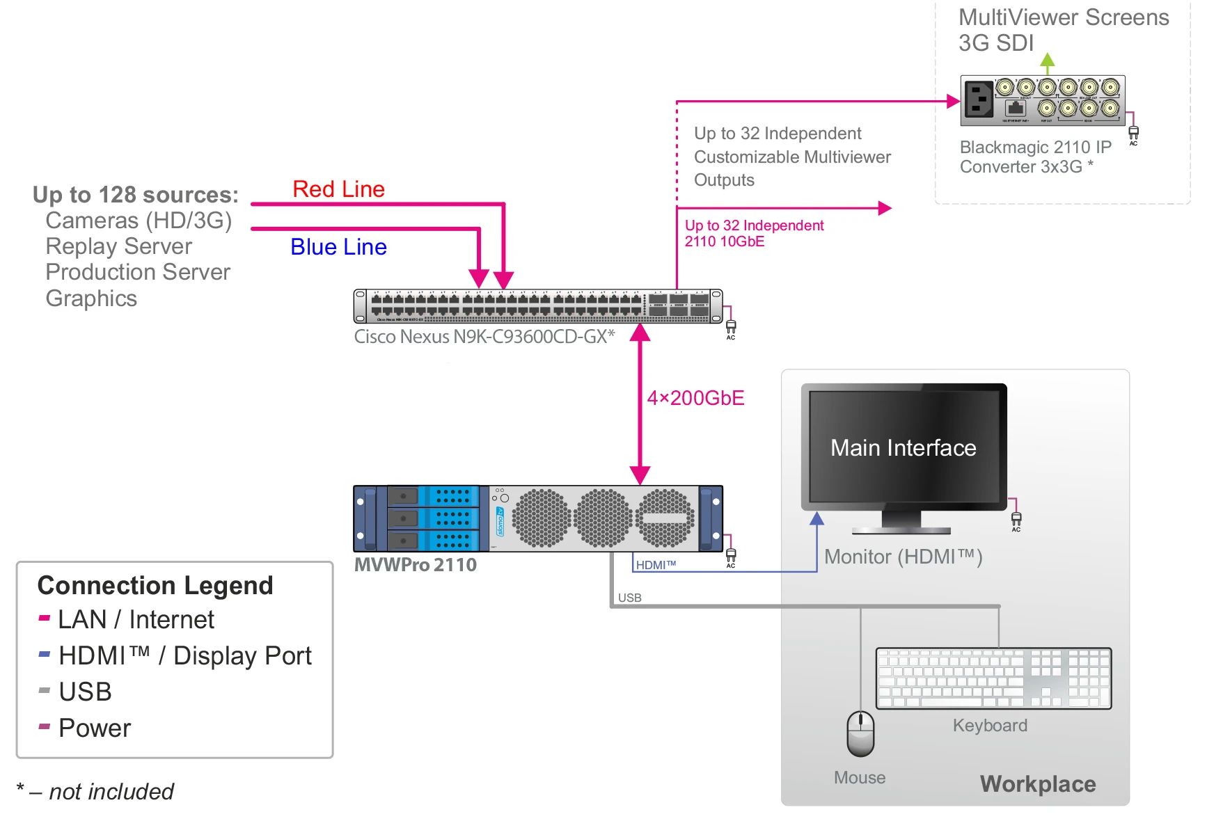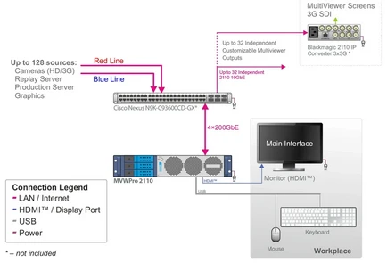 - Resolution changes require only reconfiguration of devices (server, router, graphics equipment, multiviewer), without the need for physical cable swaps.