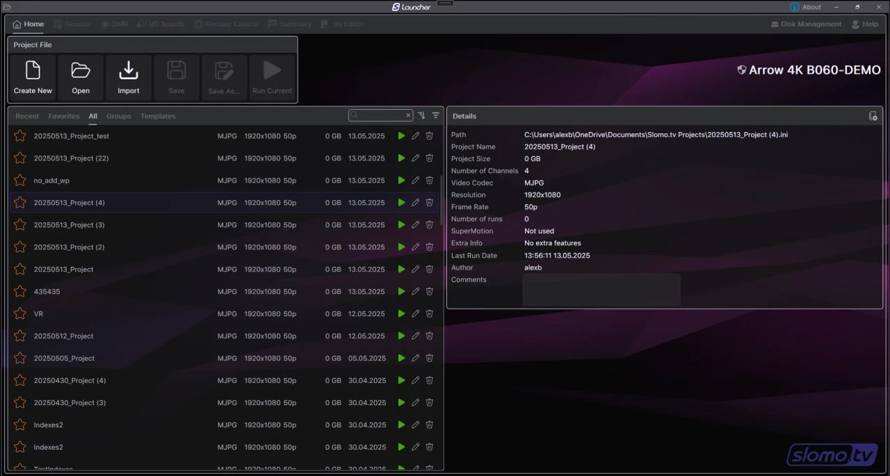 The development of Slomo.tv Launcher is rooted in two decades of experience from our users and engineers. This experience encompasses literal hundreds of thousands of hours and tens of thousands of projects carried out by our hardware-software systems. Additionally, the database of technical support requests was thoroughly analyzed to identify the most frequently performed tasks, with the intention of streamlining and reducing the workload of the support crew and creating freedom and versatility for user operations.